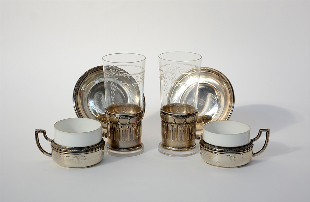 Lotto composto da un coppia di bicchieri con portabicchieri in argento e due tazze da te con piattino e portatazza in argento. Manifatture europee del secolo XX (g 320 ca.) (lievi difetti)
