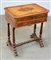 Tavolino da lavoro con gambe tornite, piano e fascia lastronati in radica di noce e intarsiati (cm 56x65x41) (difetti)