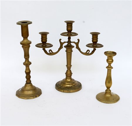 Lotto composto da due candelieri e un candelabro a tre fiamme (h max cm 35) (difetti)