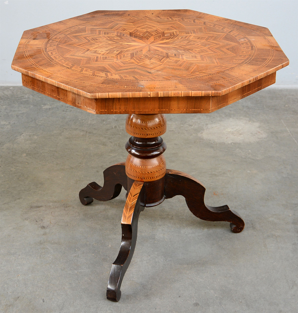 Tavolino intarsiato con piano ottagonale e sostegno a colonna tornita su base tripode (cm 75x66x75) (difetti)