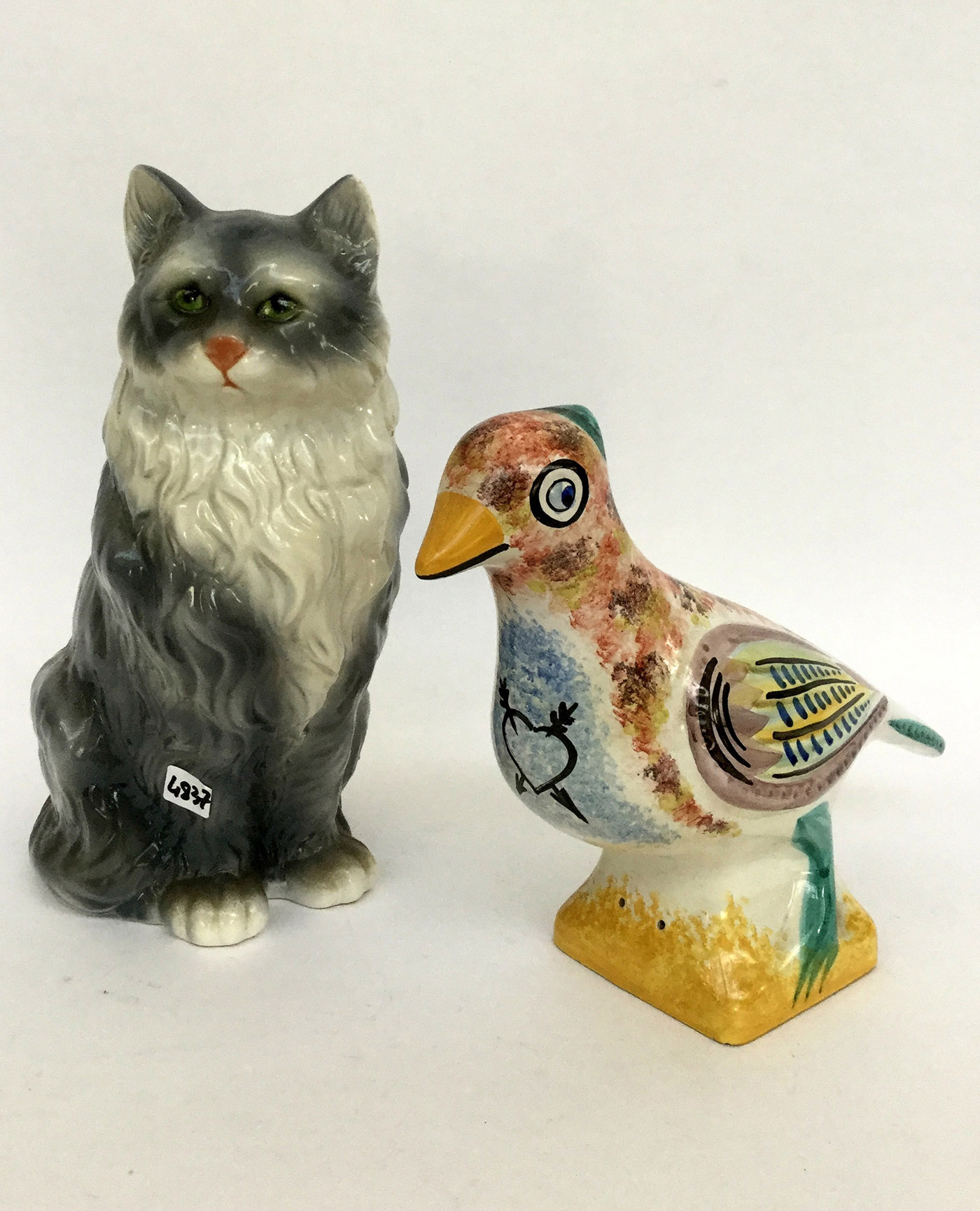 Lotto composto da un gatto in ceramica dipinta e da una quaglia in terracotta smaltata (h max cm 33) (lievi difetti)