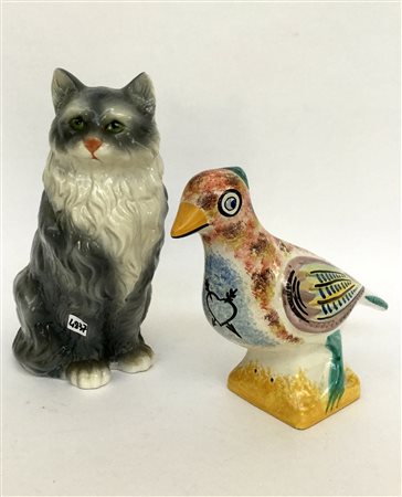 Lotto composto da un gatto in ceramica dipinta e da una quaglia in terracotta...