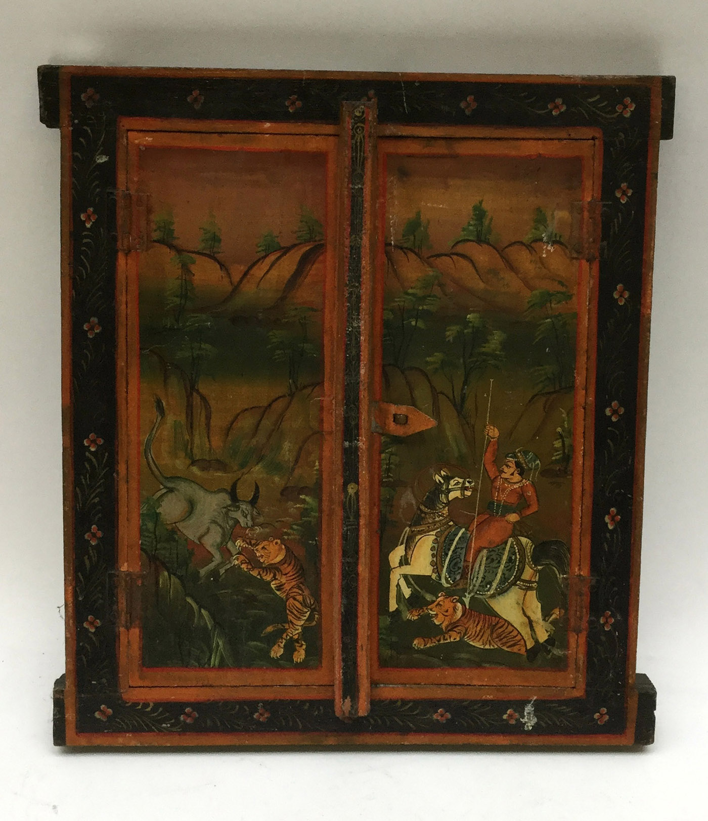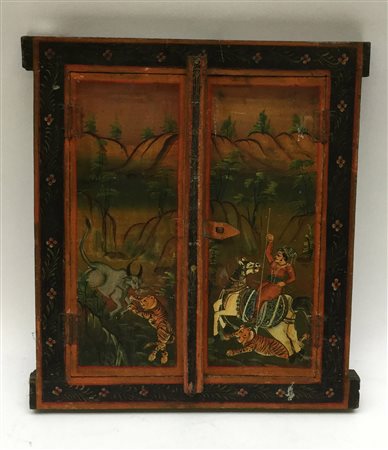 Sportello indiano a due ante, dipinto in policromia a scena di caccia (cm 40x45)