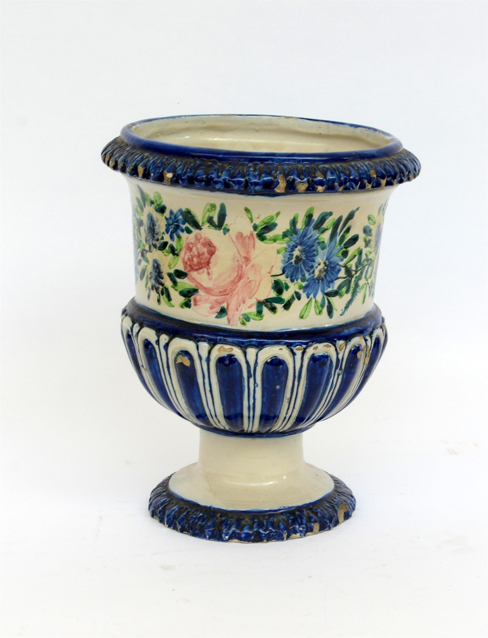 Cachepot in ceramica smaltata e decorata in policromia con corpo baccellato e fascia a motivi floreali (h cm 28) (difetti)