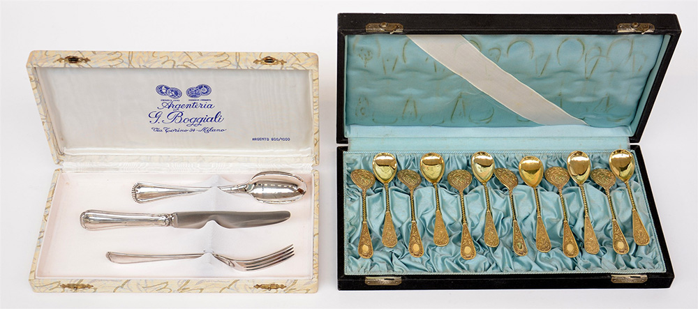 Lotto composto da un servizio da bambino in argento ed un set di cucchiaini in metallo dorato in custodie originali (lievi difetti)