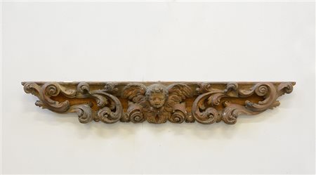 Antico fregio in legno parzialmente dorato centrato da testa di cherubino alato tra volute