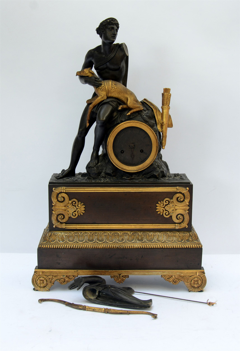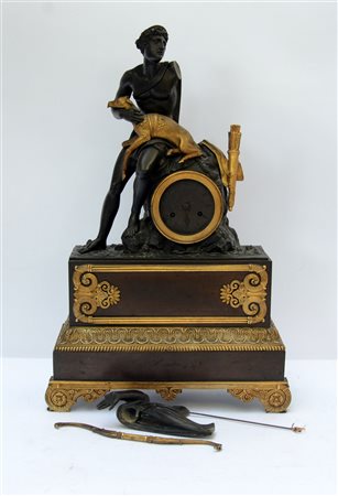 Orologio da appoggio in bronzo dorato e ossidato decorato con scena mitologica, quadrante in metallo con numeri romani, movimento con carica settimanle, suoneria delle ore e delle mezze su campanello, sospensione a filo (difetti e mancanze) (h cm 58 circa)