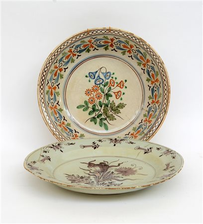 Lotto composto da un piatto ed un bacile in ceramica policroma (diametro max cm 34,5) (difetti e restauri)