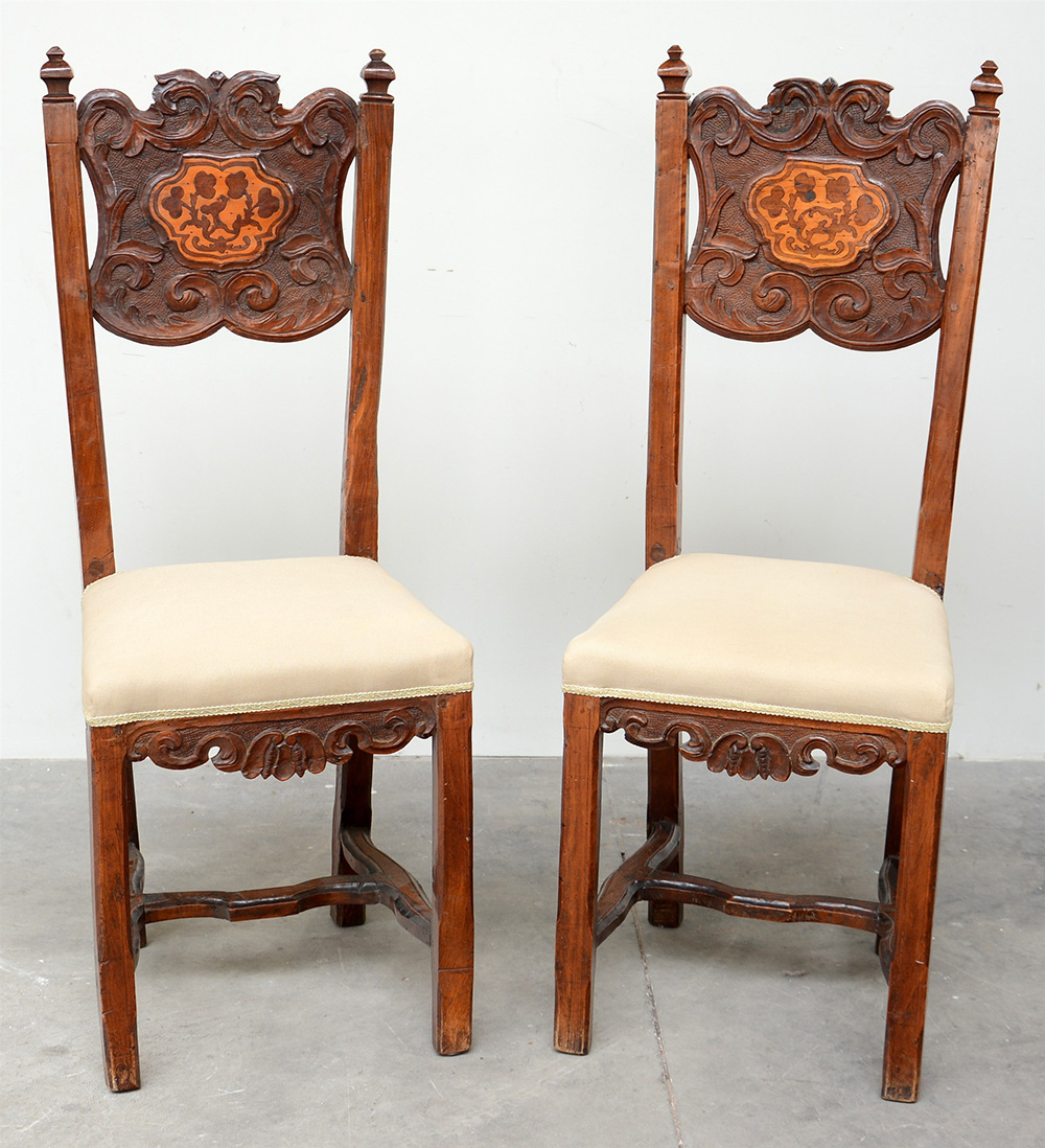 Coppia di antiche sedie in noce con schienale a giorno e cartelle intagliate,...