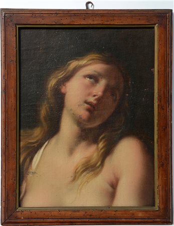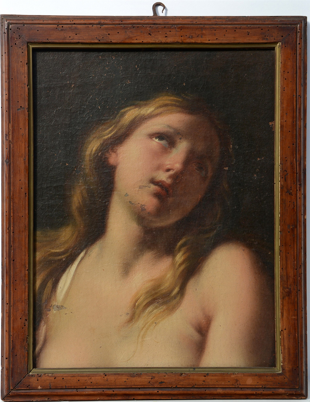 Maestro della fine del XVIII "Volto di fanciulla in estasi" olio su tela (cm 47x35) in cornice antica (difetti e restauri)