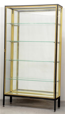 Vetrina a cinque ripiani con struttura in metallo verniciato nero e profili in ottone, fondo a specchio. Anni '60 del secolo XX (cm 110x200x38) (lievi difetti)