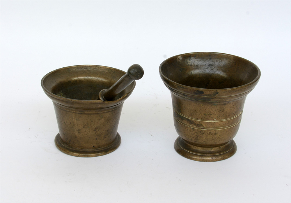 Lotto di due mortai in bronzo e un pestello (difetti)