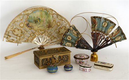 Lotto composto da due ventagli con supporti in ottone e sei scatolette di forma e fattura diverse (difetti e mancanze)