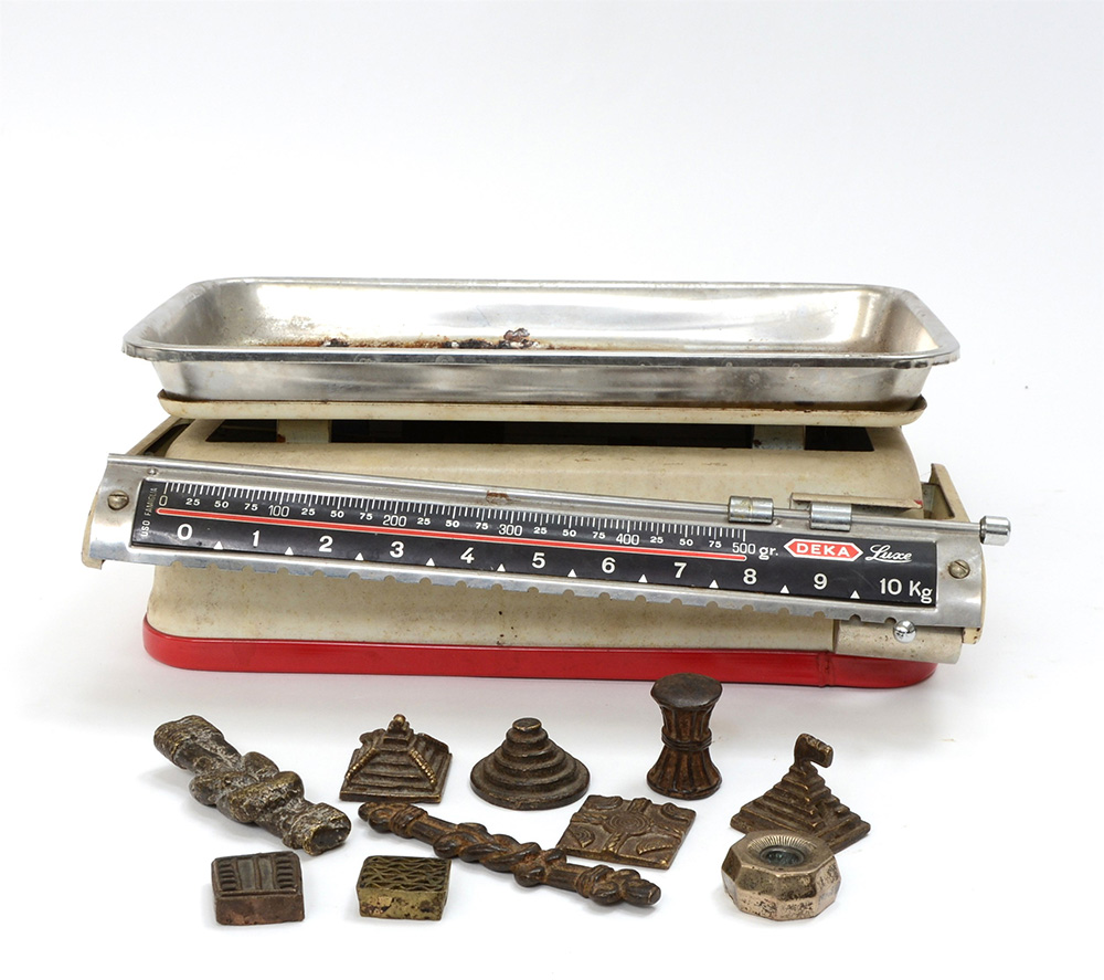 Lotto composto da una bilancia e piccoli pesi vari