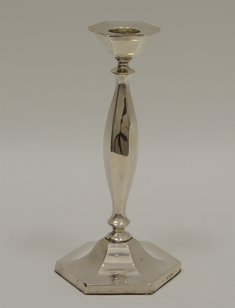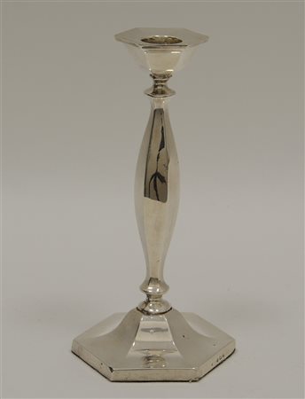 Candeliere esagonale in argento, punzoni di Birmingham 1923 (h. cm 19) (gr 150 lordi) (lievi difetti)