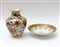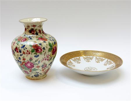 Manifattura tedesca, vaso decorato a motivi floreali e un centrotavola con rilievi in oro (lievi difetti)