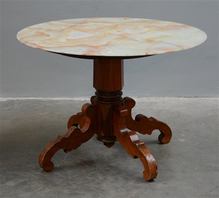 Tavolo con piano tondo in onice, gamba centrale ottagonale terminante a quattro piedi sagomati (d cm 110, h 78) (difetti)