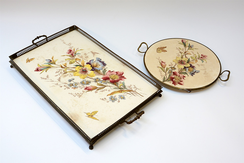 Lotto composto da un vassoio e un sotto pentola con piani in ceramica dipinti a decori naturalistici, anse e ringhiera in metallo (difetti)