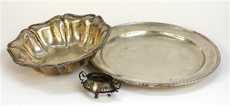 Lotto in argento composto da un vassoio, una ciotola e una porta saliera. Italia, metà sec. XX (d. cm 27) (gr tot. 480 ca.) (difetti)