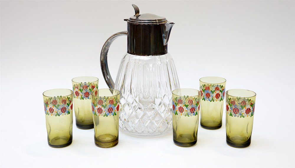 Lotto composto da una grande brocca in cristallo con presa e versatoio in metallo e sei bicchieri verdi dipinti a fiori (lievi difetti)