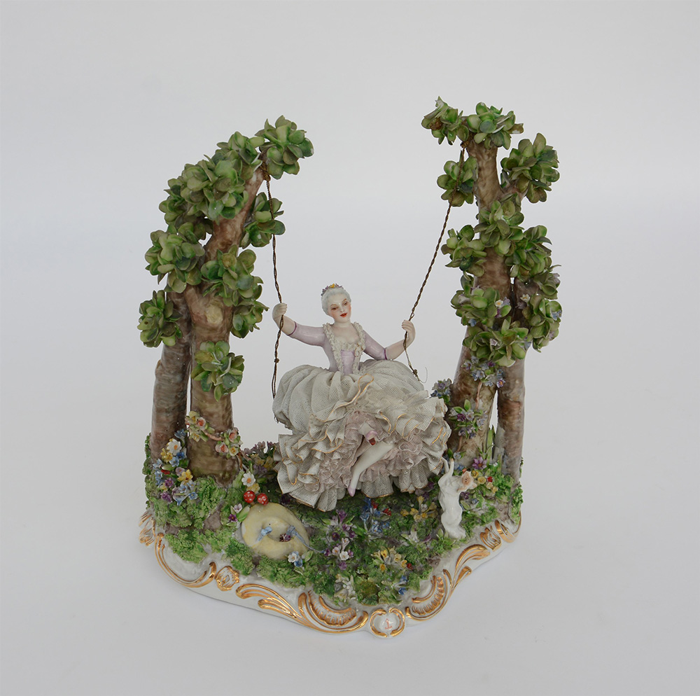 Manifattura italiana, scultura in porcellana raffigurante una dama settecentesca in altalena su un prato fiorito, firmata Fabris sotto la base (cm 25x27x20) (difetti e mancanze)