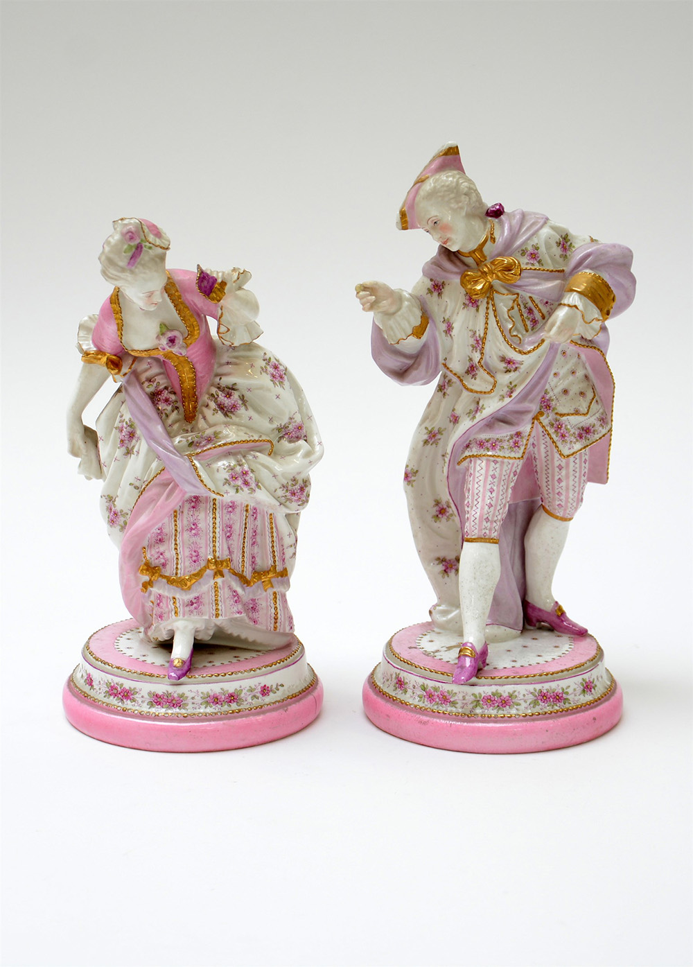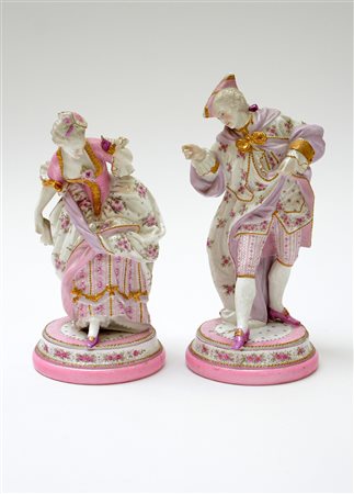 Coppia di sculture raffiguranti una dama e un gentiluomo in porcellana decorata in policromia nei toni del rosa (h max cm 25) (difetti)