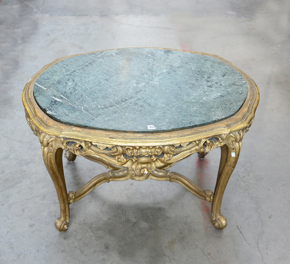 Tavolino da salotto in legno intagliato e dorato con piano in marmo verde (cm 82x53x62)