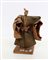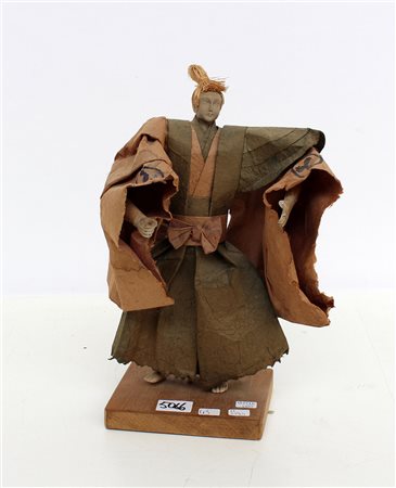 Statuina raffigurante un samurai con abiti modellati in carta, base in legno (h tot. cm 27) (difetti e mancanze)