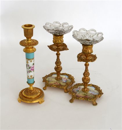 Manifatture diverse. Lotto composto da tre candelieri in metallo dorato, porcellana e smalti policromi