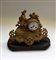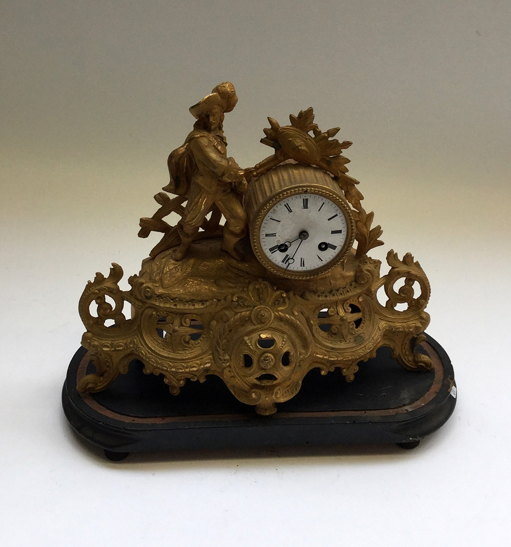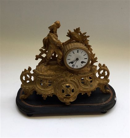 Pendola in metallo dorato decorata con figura di moschettiere su base in legno, quadrante in smalto bianco con numeri romani, movimento con carica settimanale, suoneria delle ore mezze su campanello (cm 37x30) (difetti)