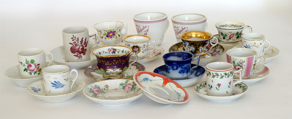 Lotto composto da quattordici tazze e sedici piattini di manifatture diverse,...