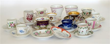 Lotto composto da quattordici tazze e sedici piattini di manifatture diverse, alcune del sec. XVIII (difetti e restauri)