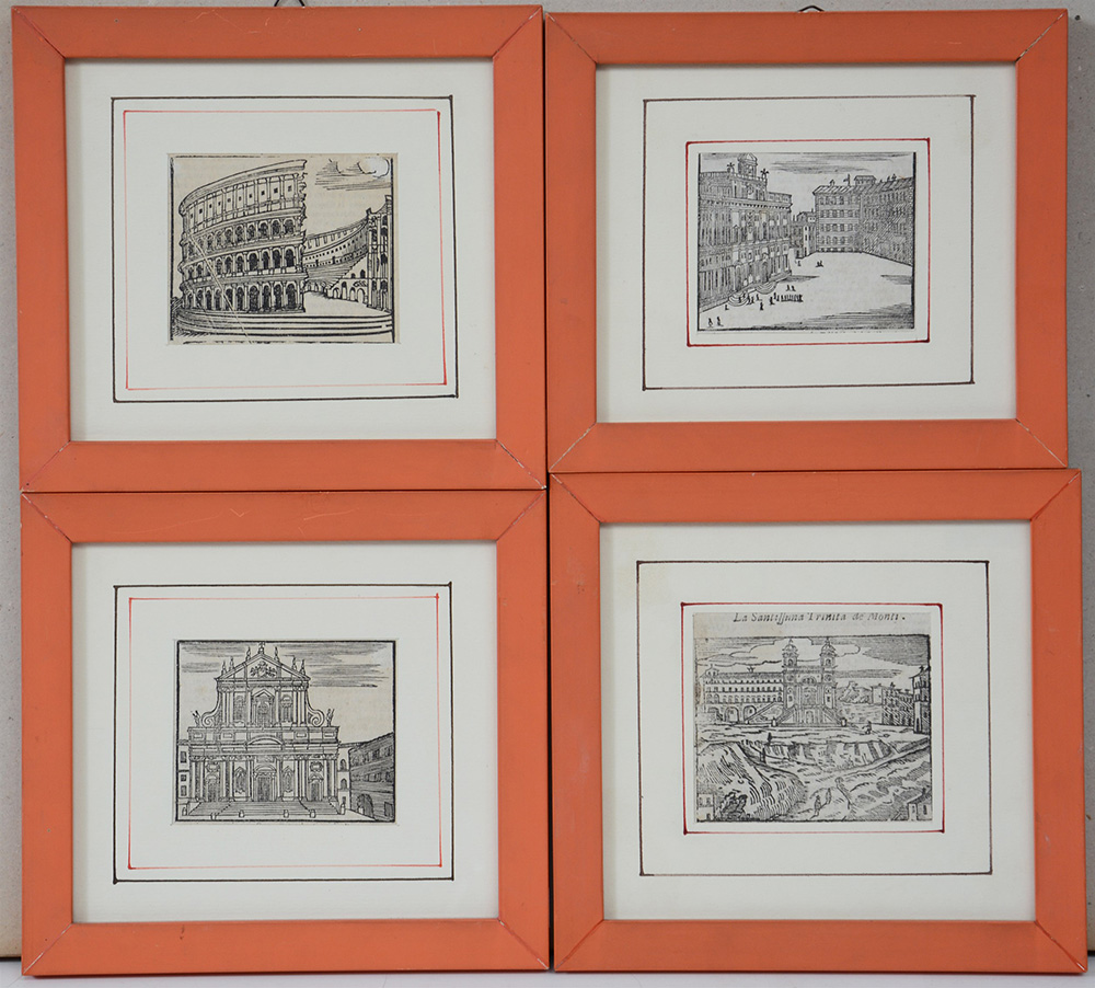 Gruppo di quattro piccole stampe (cm 15x17) raffiguranti piazza e monumenti, in cornici