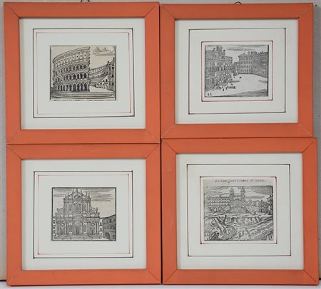 Gruppo di quattro piccole stampe (cm 15x17) raffiguranti piazza e monumenti,...