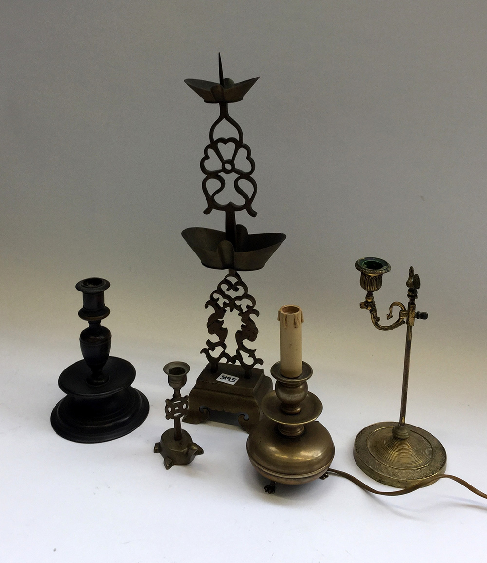 Lotto composto da cinque candelieri diversi in bronzo e metallo
