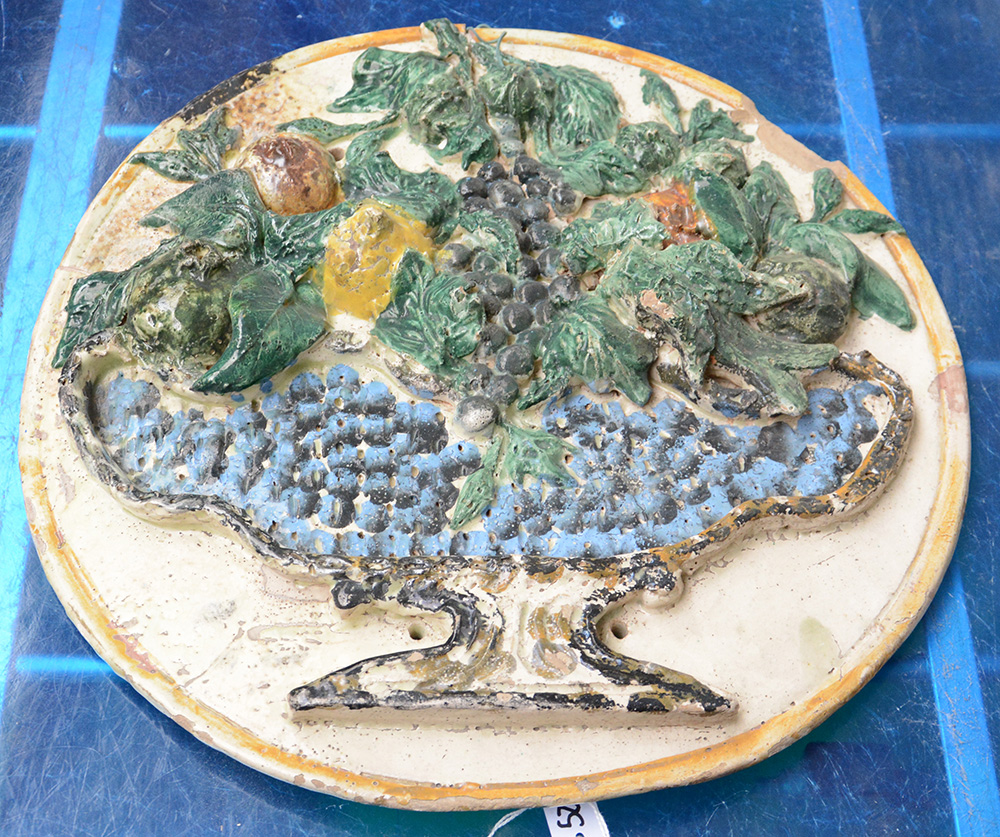 Placca in maiolica di forma circolare decorata in rilievo a vaso con frutta traforata. Secolo XX (d cm 40) (difetti e mancanze)