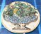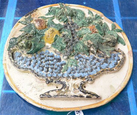 Placca in maiolica di forma circolare decorata in rilievo a vaso con frutta...