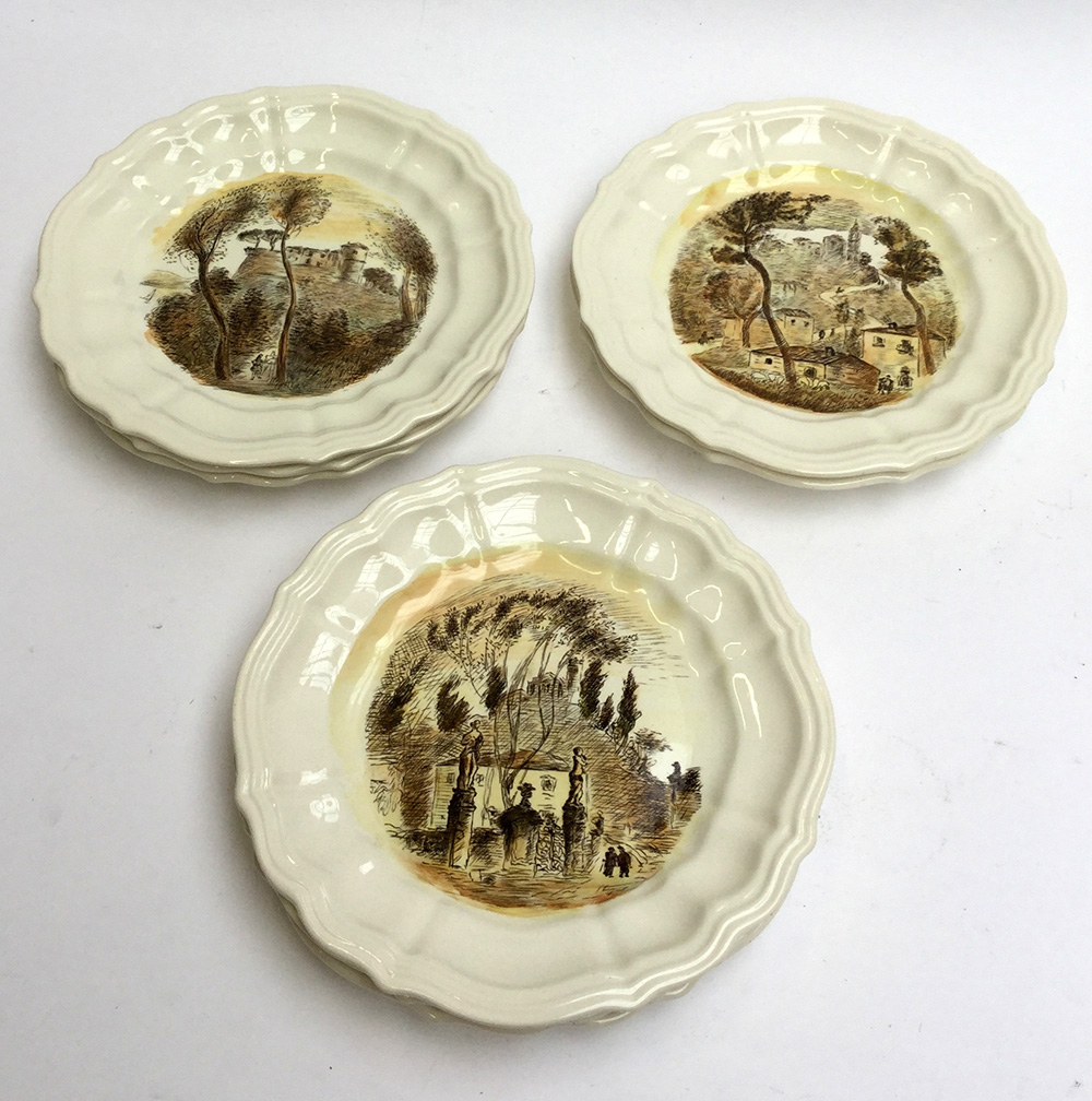 Gruppo di otto piatti in terraglia forte decorati da Michele Cascella raffiguranti località italiane. (d cm 26) (uno con gravi difetti)