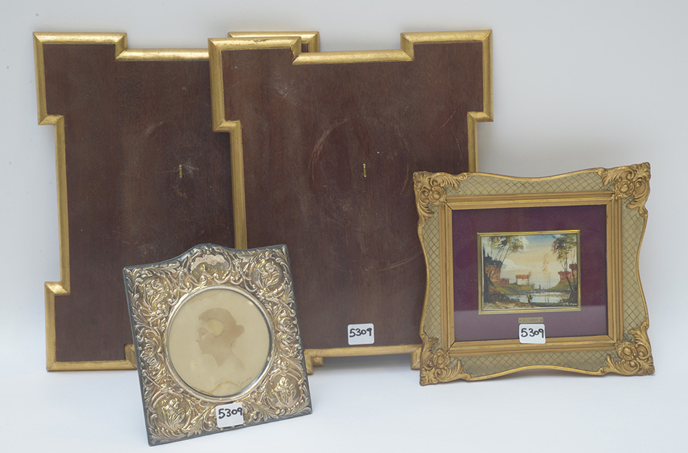 Lotto composto da una cornice da tavolo laminata in argento, un quadretto e due pannelli portaorologio in legno (difetti)