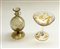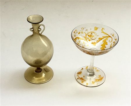 Lotto composto da un'ampolla in vetro soffiato e ambrato ed un calice decorato a doraturw. Secolo XIX, misure differenti