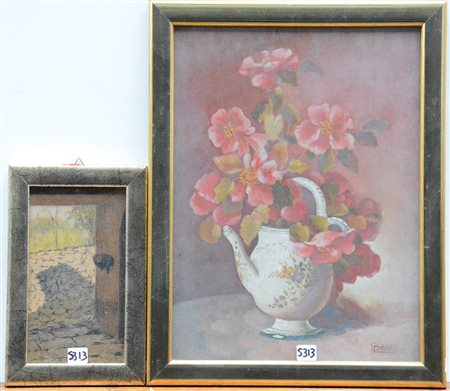 Lotto composto da un dipinto ad olio su compensato raffigurante una brocca con fiori, firmato L. Sambo, ed un pastello su cartoncino raffigurante uno scorcio di androne, firmato Curty, locato e datato 1937 al verso. In cornici ( lievi difetti)