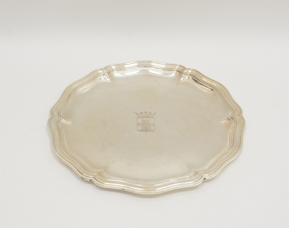 Piatto in argento di forma circolare sagomata con bordura modanata e stemma...