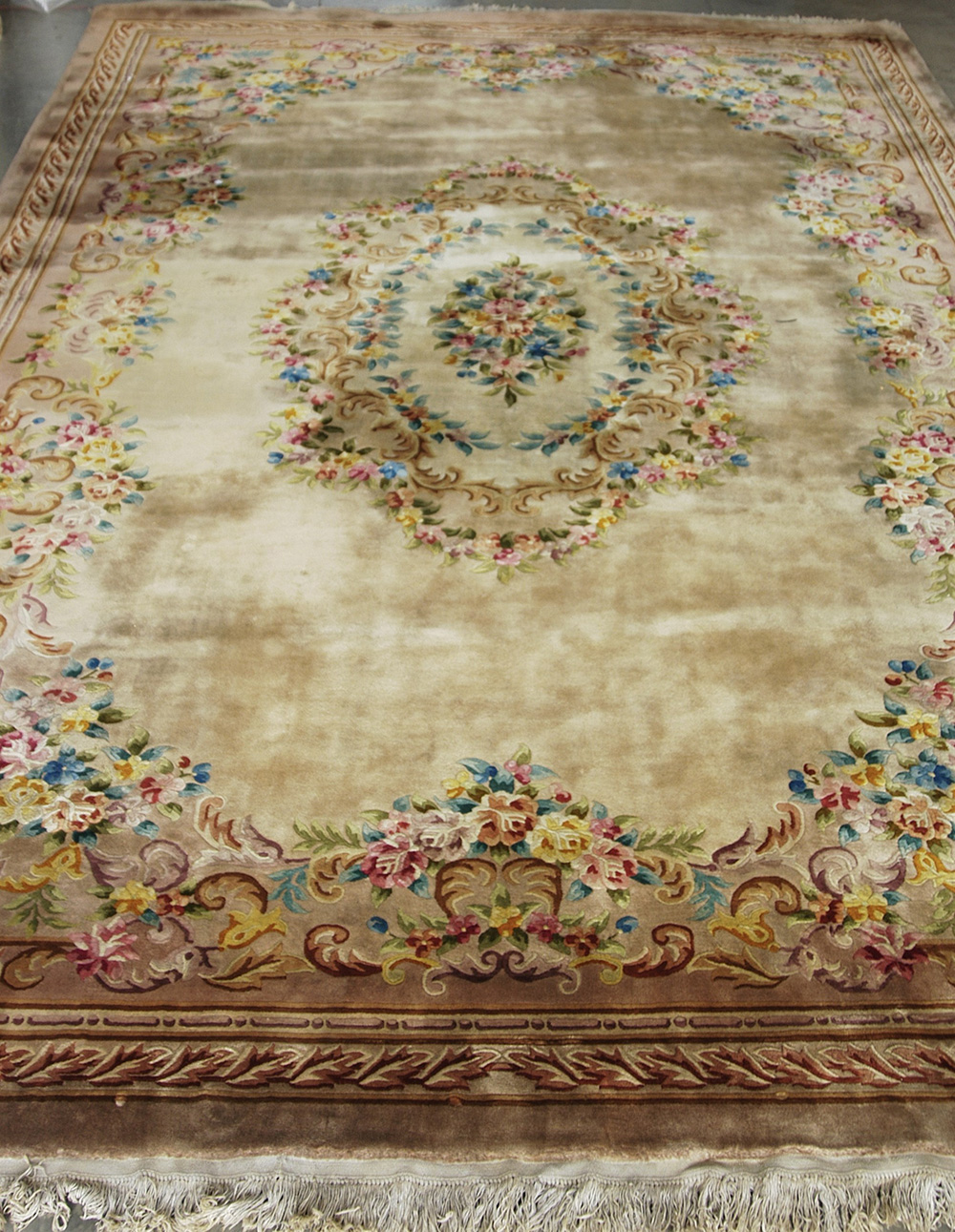 Grande tappeto Cina a fondo beige decorato a motivi floreali policromi sparsi e medaglione centrale. Inizio sec. XX (cm 546x358) (difetti)