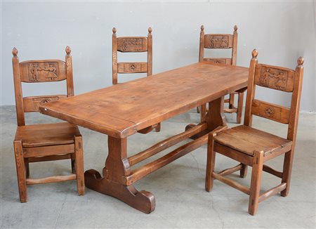 TARPAC (Alto Artigianato Toscano) Fornitura composta da tavolo e quattro sedie in legno massello. Tavolo con gambe sagomate riunite da traversa piatta (cm 218x78x80) le sedie con schienale a cartelle scolpite con figure stilizzate e rosoni. Marcati TP sotto il piano del tavolo e dietro lo schienale delle sedie (difetti)