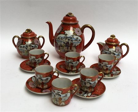 Manifattura giapponese, servizio da caffè in porcellana composto da caffettiera, lattiera e zuccheriera con sei tazzine e cinque piattini, decorato in policromia a scene di vita su fondo arancio (difetti) (h. max 20 cm.)