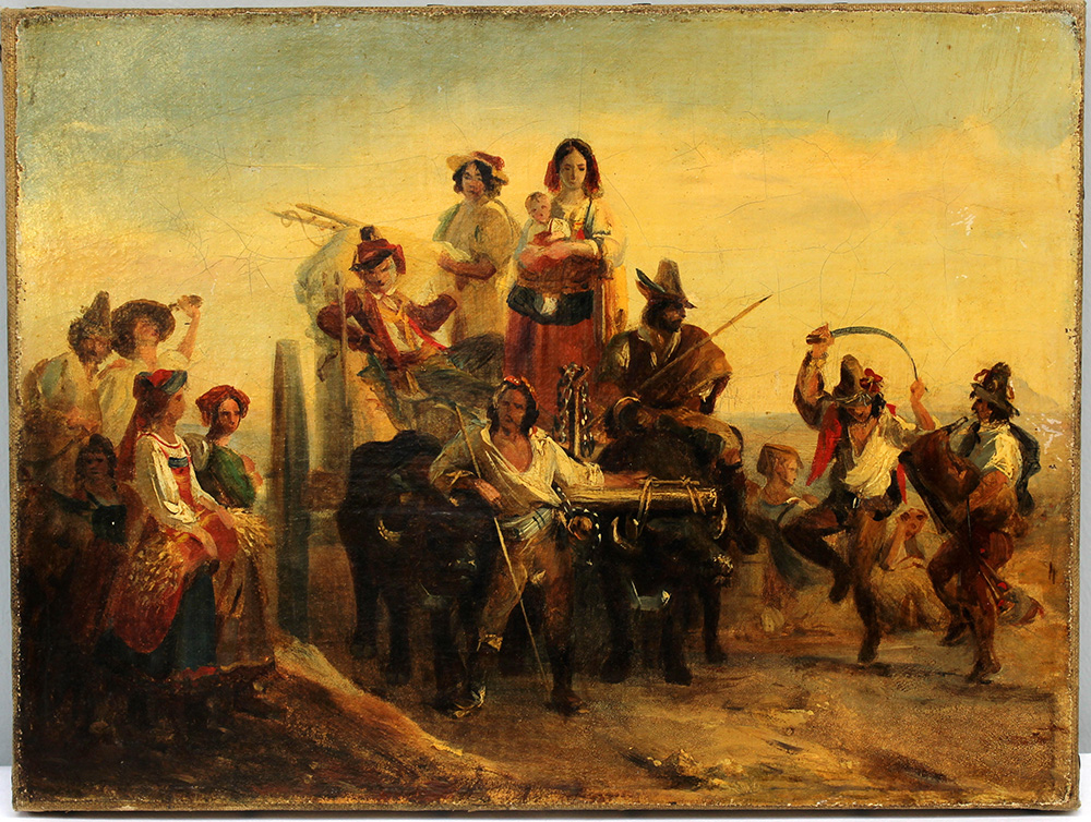 Scuola del Sec. XIX, "Figure" olio su tela (cm 24x32,5). Al retro iscritto Leopold Robert (lievi difetti)