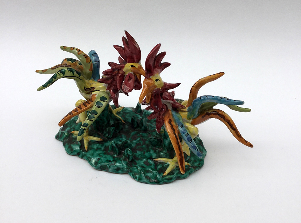 Manifattura Italiana sec XX. Gruppo di due galli da combattimento in ceramica policroma (h cm 17)