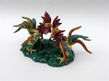 Manifattura Italiana sec XX. Gruppo di due galli da combattimento in ceramica...