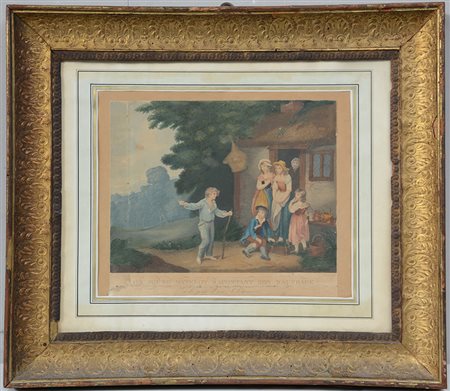 Antica acquaforte e acquatinta da William Redmore Bigg raffigurante "Un jeune matelot racontant son naufrage" (ritaglio) (rifilato cm 28,5x33) in cornice (difetti)