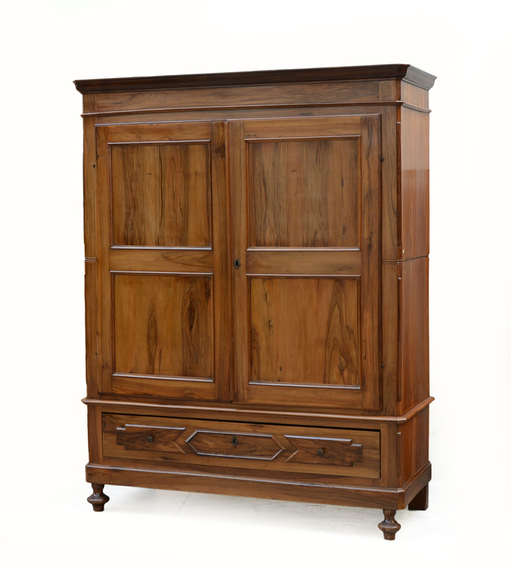 Armadio in noce e radica di noce a due ante riquadrate e un cassetto pannellati, piedi anteriori torniti, secolo XIX (cm 158x198x58)(difetti)